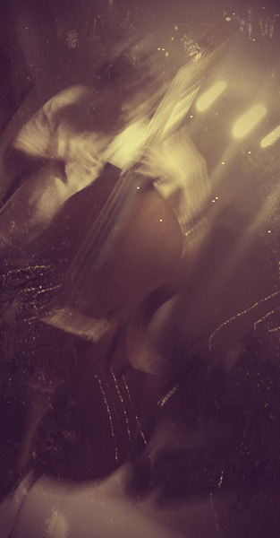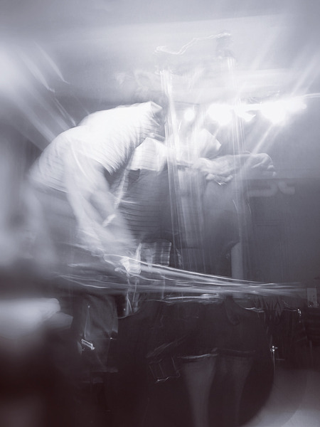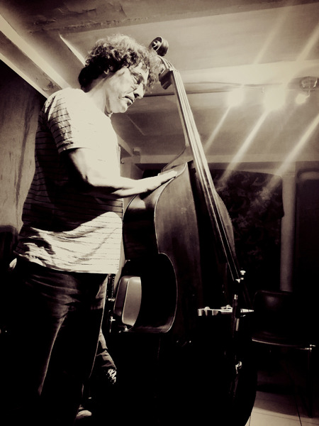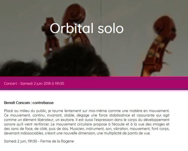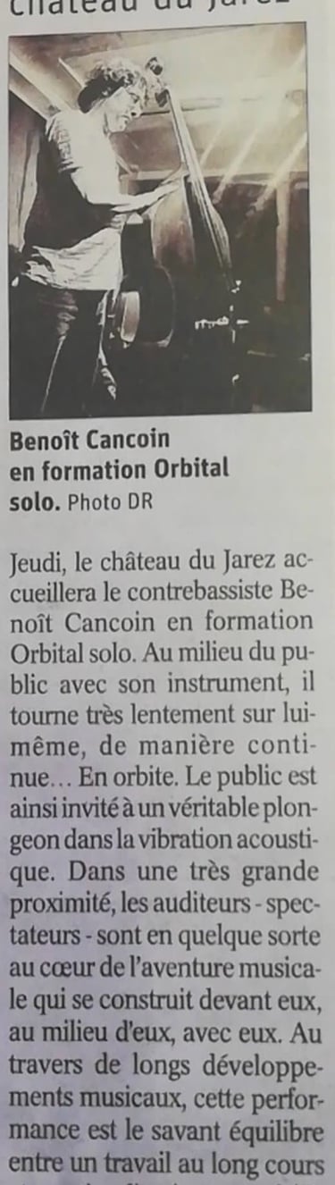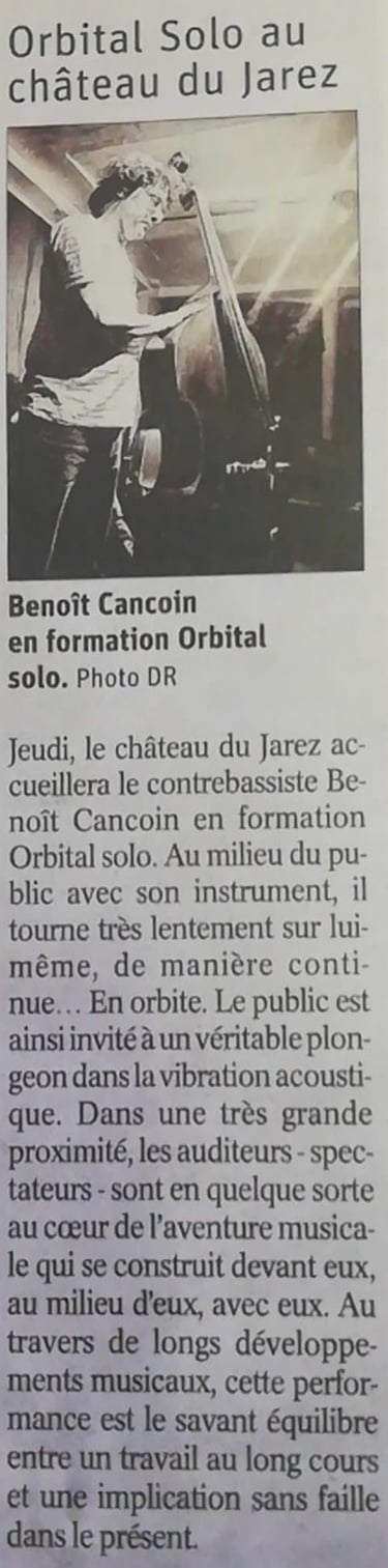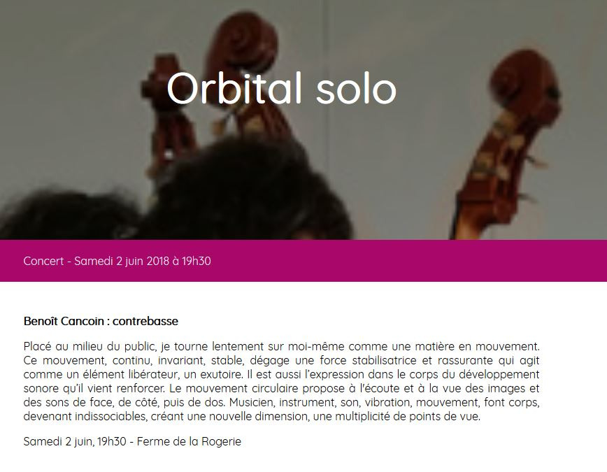 « Pour l’Orbital solo, je me tiens au milieu du public avec ma contrebasse et tourne lentement sur moi-même. Un mouvement circulaire continu, invariant, se met ainsi en place pour toute la durée de la performance, la pique de l’instrument comme « orbite stationnaire ».